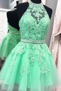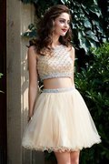 Elastischer Gewebter Satin Tüll Natürliche Taile Kurzes Abiballkleid mit Perlen