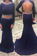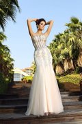 Ärmelloses Perlenbesetztes Trägerloser Ausschnitt Satin Sweep Train Abendkleid